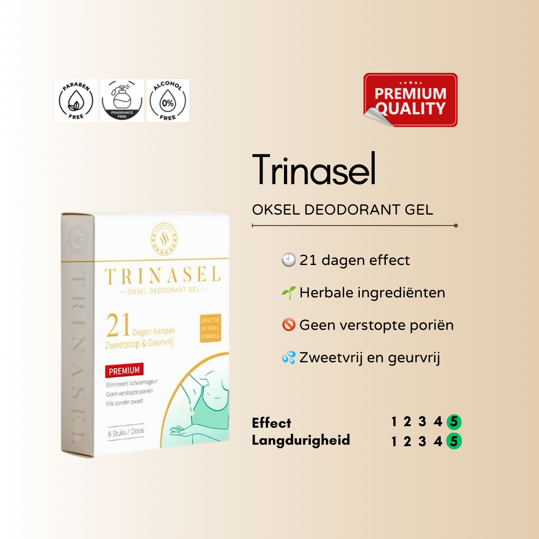 Veel deodorants werken slechts één tot drie dagen en blokkeren daarbij de poriën, wat ontstekingen kan veroorzaken. Trinasel zorgt ervoor dat de zweetklieren in een ruststand komen, waardoor ze niet overmatig produceren. Dankzij onze unieke formule op basis van traditionele kruiden houdt de werking tot wel 21 dagen aan na slechts één toepassing – een resultaat dat geen enkele andere anti-transpirerende gel tot nu toe heeft weten te evenaren.